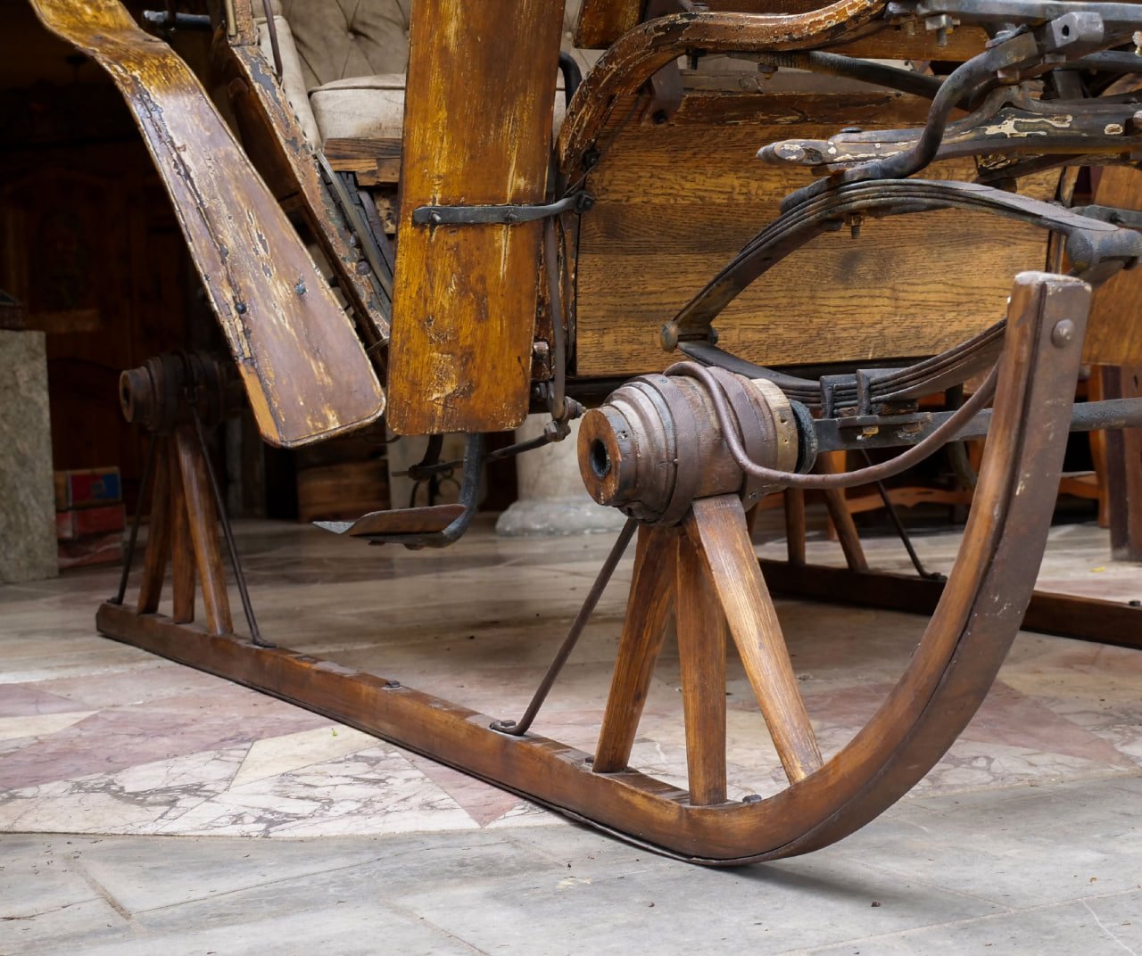 All of the wood for the body and fenders is hand steam bent, old growth lumber and hand finished (including 5-8 coats of hand applied paint added over the original oil finish in different colors over the 168 years). Notice the sleigh runners are cut from one piece of old growth timber no joints or seams. The sleigh runners seem to be the original finish. The wheels were hand made from match grained hard wood and the forge iron was hand fitted to the expansion of the wheels.