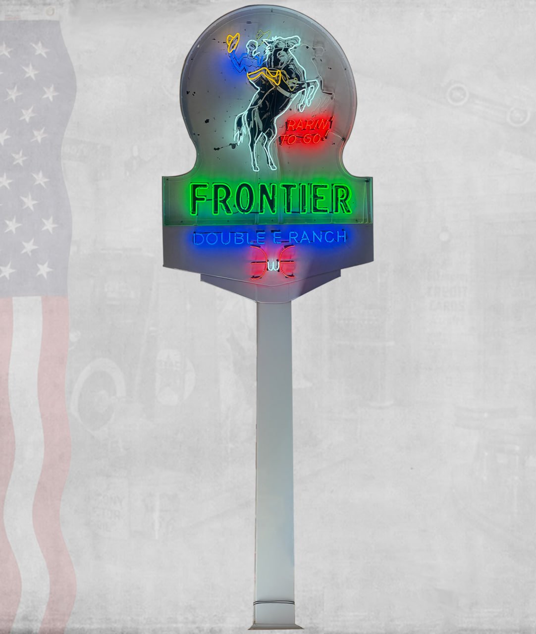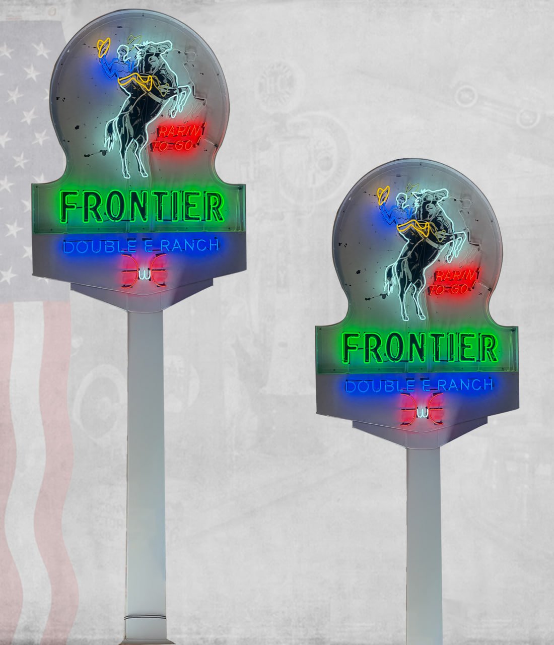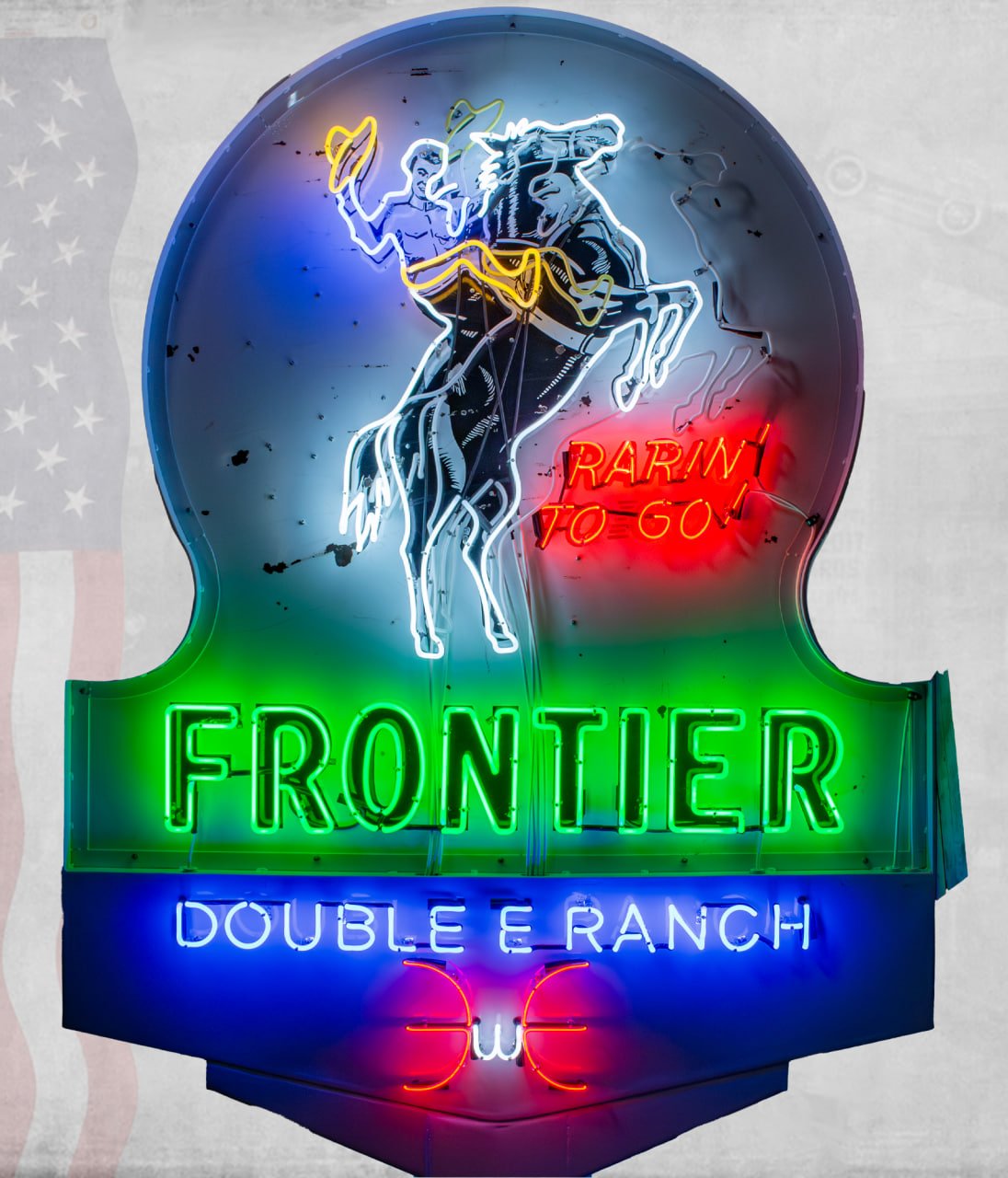 - Rewiring neon tubing by hand using vintage-correct colors: green for “Frontier,” red for “Rarin’ to Go!”, and multi-color lighting for the bronco and cowboy.