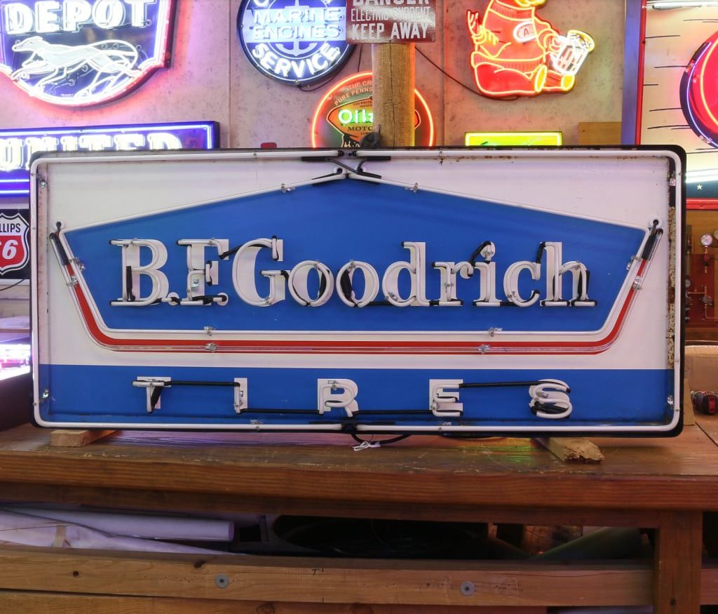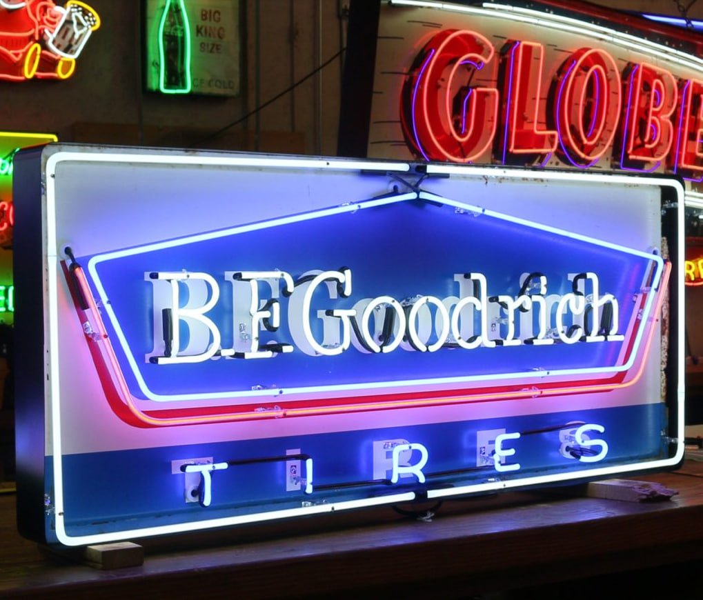 By the mid-20th century—when this neon sign was originally produced—B.F. Goodrich was a dominant force in automotive culture, fueling everything from classic hot rods to wartime vehicles.