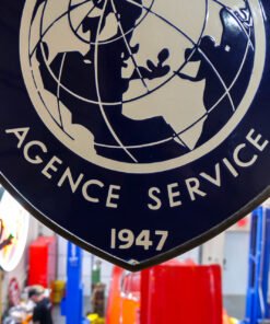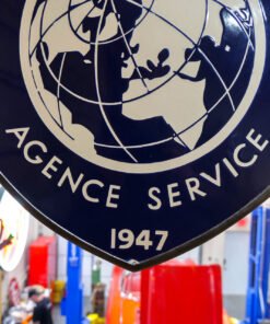 This original vintage Ford Agence Service sign from 1947, is just one of hundreds of collectible automobilia and petroliana collectibles currently for sale from ArtFactory.com. This double sided sign, genuine vintage porcelain enamel sign measures 31 inches wide by 33 inches tall, and is 3 inches deep including the original metal hanging bracket. The sign itself measures 24 inches tall by 18 1/2 inches wide at its largest points. It read reads “FORD Agence Service 1947”, and has a graphic of the earth in the center of the sign. This is a 2 color sign that features a 2 sections, with the top section having a white background and blue lettering, while the lower portion has a blue background with white graphics and lettering. It is an authentic advertisement that was originally displayed at FORD dealerships in the 1940’s, and is extremely rare and hard to find in any condition. A truly rare find, this sign includes the ORIGINAL genuine iron hanging bracket. Like all of our collectible signs, it is sold in original, unrestored condition as pictured. This sign has a few dings in the sign face, but overall is in great condition for being over 70-years-old.
