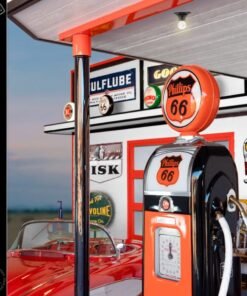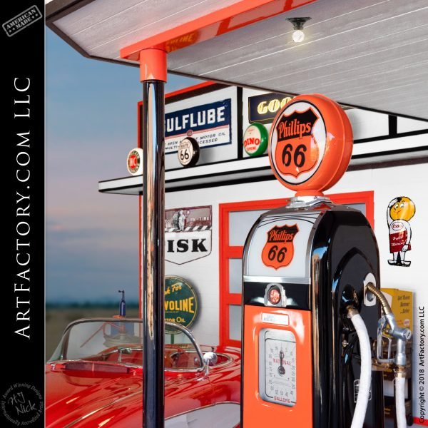 At MancaveArtCollectibles.com we can help you find that one special centerpiece item for your collection, or as shown here, we can outfit and entire gas station themed mancave or game room with original collectible petroliana. For this vintage gas station, we started with a pair of 1950’s era Phillip’s 66 gas pumps, and built an entire vintage service station from the ground up. These have been displayed on a custom, Art Deco style, Phillips 66 theme rolling, lighted island cart. We can customize a heavy collectible display cart in any way that you choose, and in this case, is an extravagant work of fine art. We can custom build these display carts in any style, and to fit as many or as few pumps as you like.