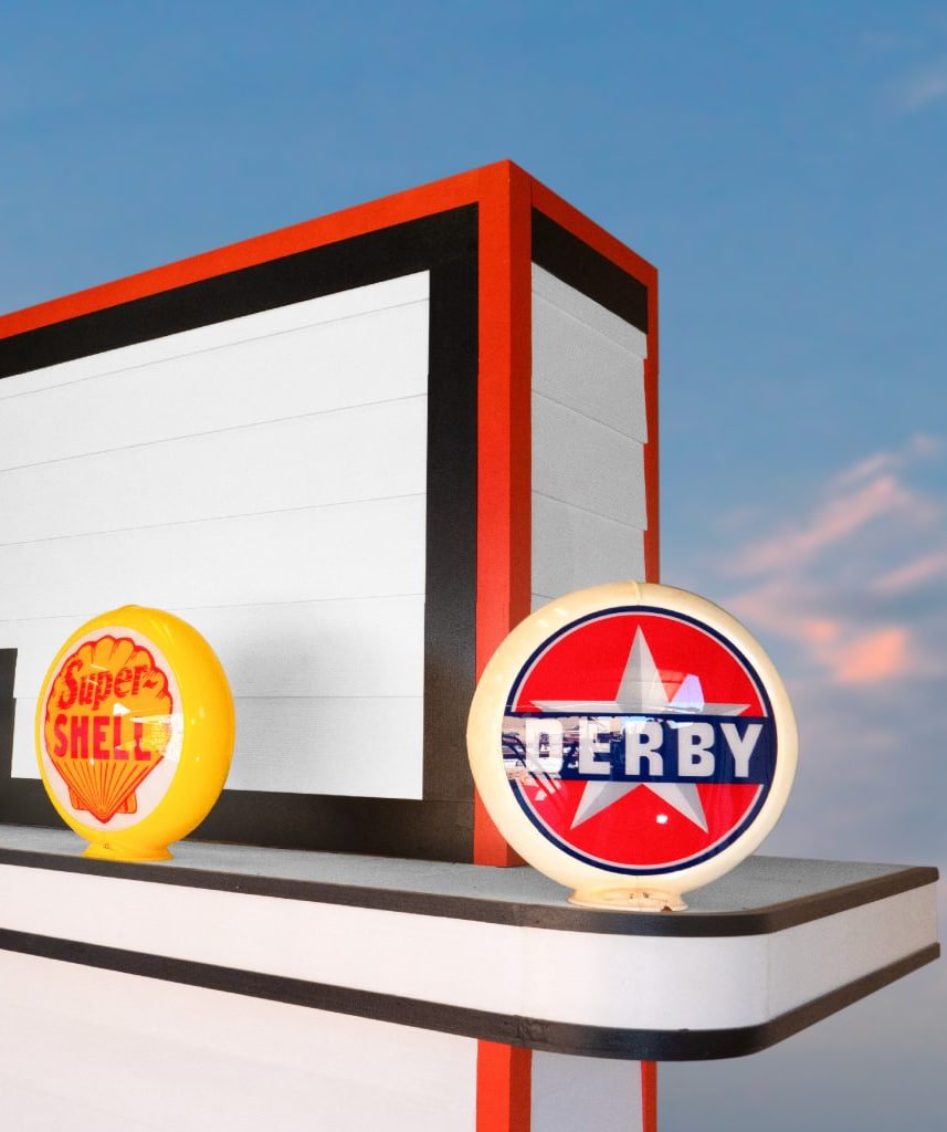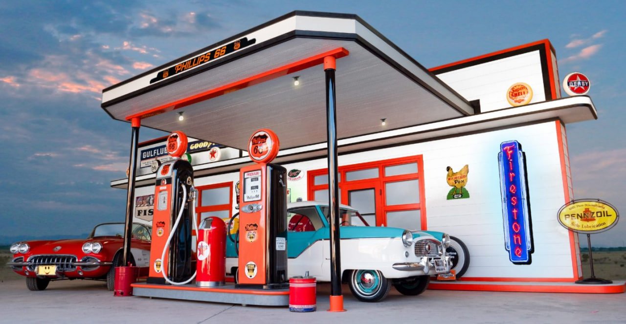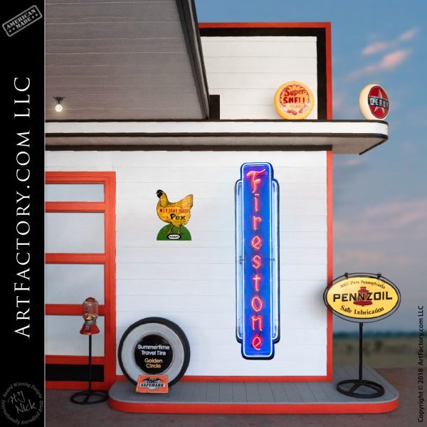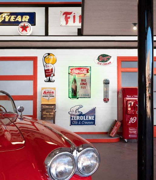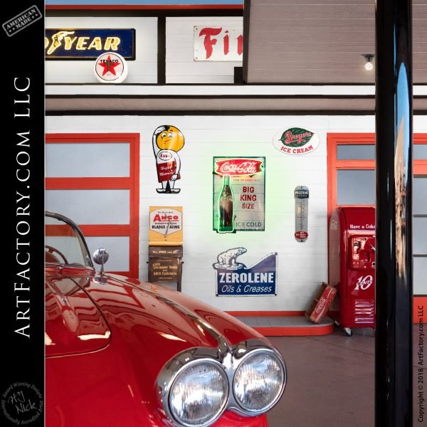 This includes the structural building, original restored vintage gas pumps, authentic porcelain and neon lighted signs, oil pumps, unique petroliana collectibles, restored soda vending machines, and even classic cars. We are truly A ONE STOP SHOP when it comes to not just outfitting, but also building a custom vintage gas station themed man cave or game room.