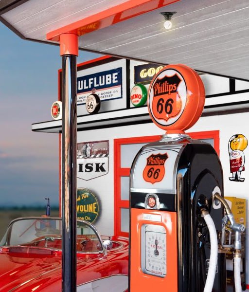 To complete the decor, this customer chose to add a number of authentic, period items from our vast collection, as pictured below. In all, the vintage gas station recreation is complete with advertising signs, other unique collectibles, and even classic vehicles from the era. Like all of our collectibles and advertising, these items are guaranteed authentic, investment quality items. To get started on the gas station themed mancave of game room of your dreams, call us to at 1-510-671-0430. We can build a collection of items and customize our restored vintage gas pumps to any station theme that you choose. This includes Texaco, Sinclair, Standard Oil, or any of America’s most iconic gas companies. The sky is the limit when customizing your game room with fine art quality vintage petroliana from our extensive selections of rare and sought after items.