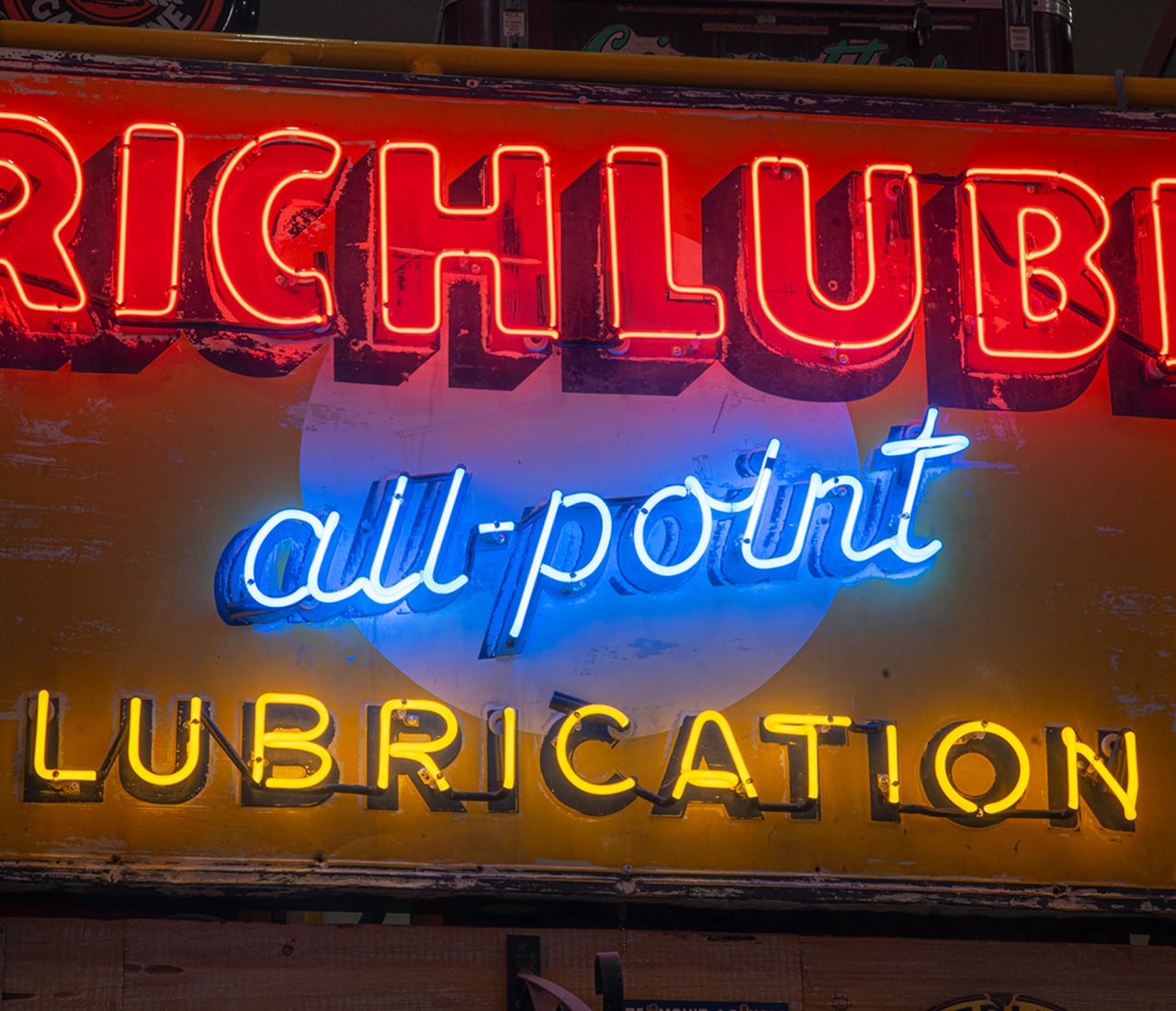 - Color: Multi-color – Red, Blue, Yellow on Porcelain/Steel Background Neon Color: Red (“Richlube”), Blue (“All-Point”), Yellow (“Lubrication”)