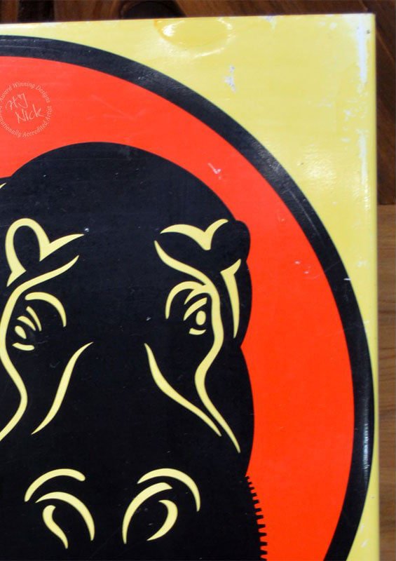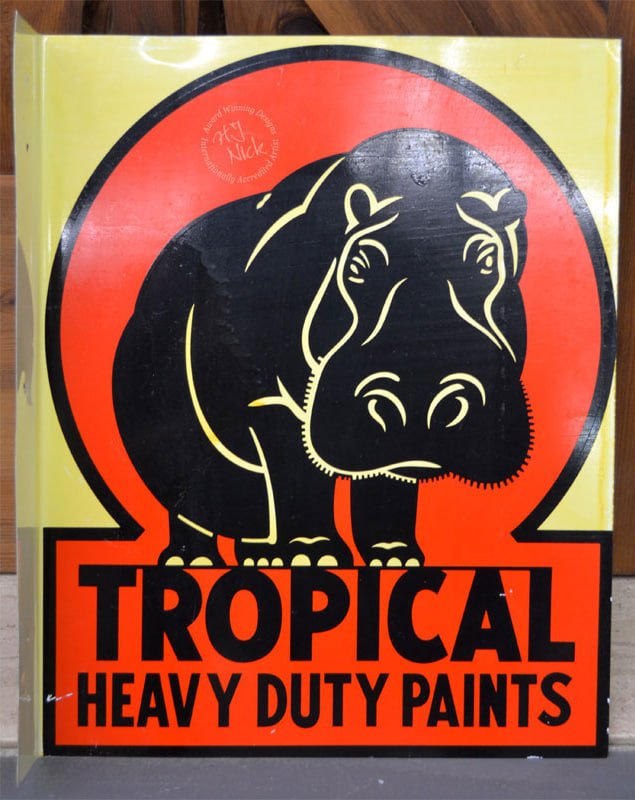 We have one of the largest selections of genuine, vintage Americana signs available anywhere. This is a rare, original Tropical Heavy Duty Paints Sign by The Tropical Paint and Oil Company from the 1950’s. The sign has an orange and yellow background. It is a vintage, double sided, tin litho flange, and reads “TROPICAL HEAVY DUTY PAINTS” in black lettering against the orange portion of the background. A graphic of a hippopotamus in black on the center of the sign. This classic advertisement is an original hanging sign that was displayed in general stores, and retailers, who sold Tropical Heavy Duty Paints during the 1950’s. This vintage Tropical Heavy Duty Paints sign is the kind of rare collectible item that will add a statement to your man cave, lady lounge, or game room. This sign won’t last long, as they are becoming more popular as the years go by, and fewer folks are letting these signs leave their collections.