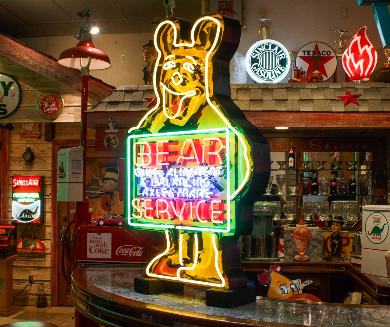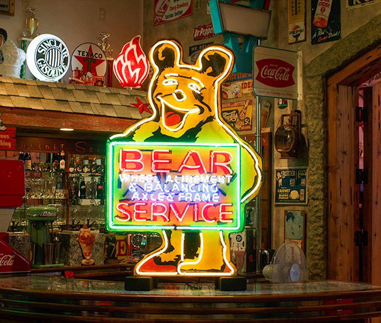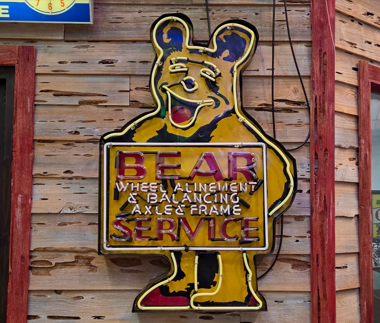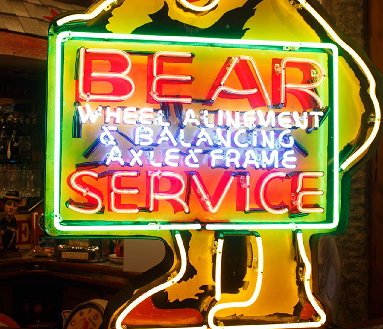The Bear Service neon sign comes from a classic era of American roadside advertising, dating back to the golden age of the automobile. The Bear Manufacturing Company, founded in Rock Island, Illinois in 1917, was one of the pioneers of wheel alignment and balancing equipment. Their name, “Bear Service,” quickly became synonymous with trustworthy automotive care during the mid-20th century.
