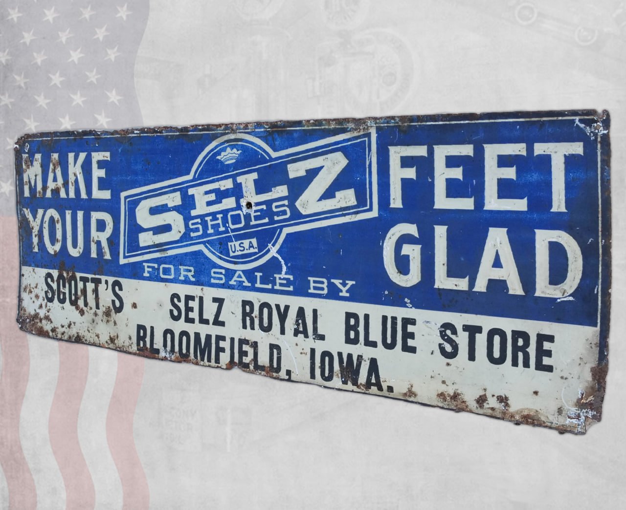 Vintage Selz Shoes Sign: Bloomfield, Iowa “Make Your Feet Glad”